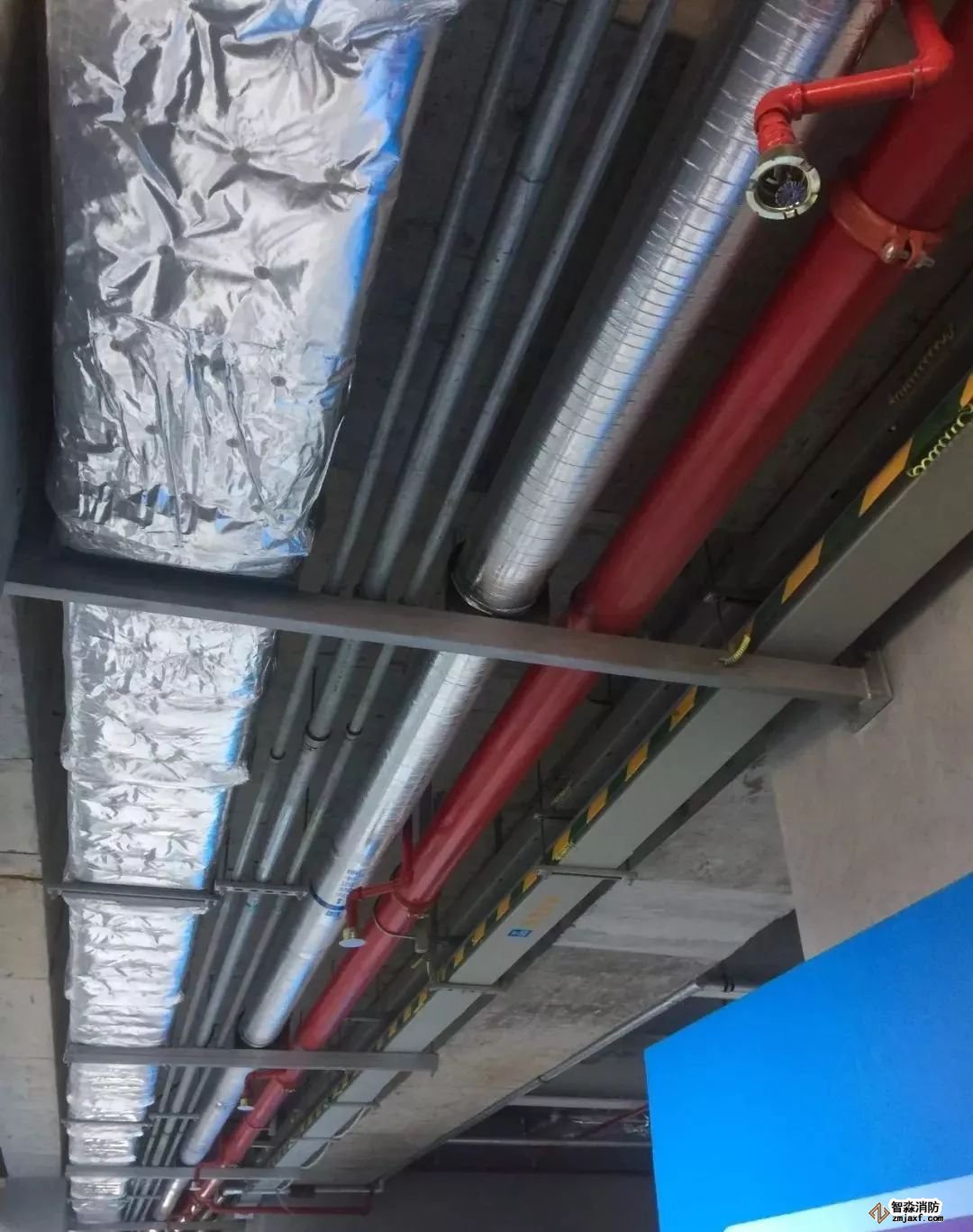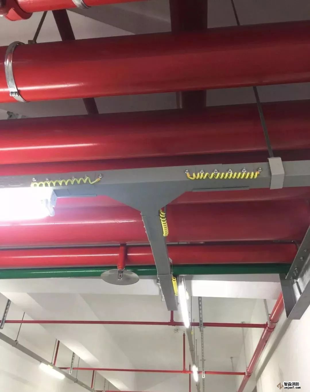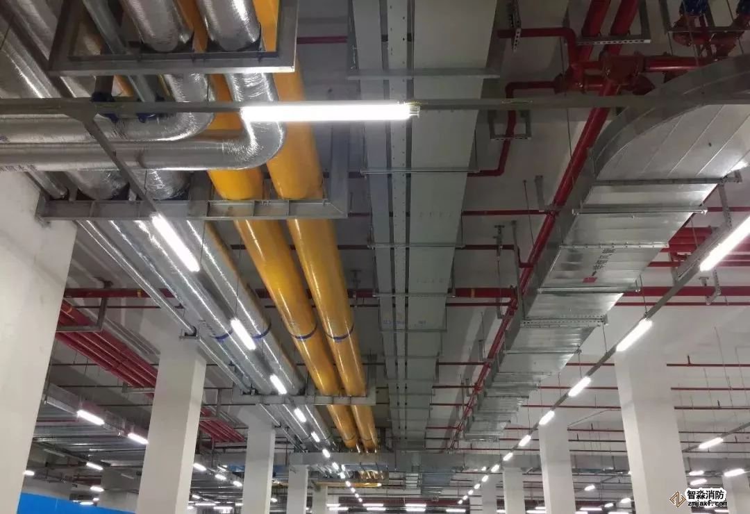消防噴淋管道間距一致,標(biāo)識清楚、成排成線。
