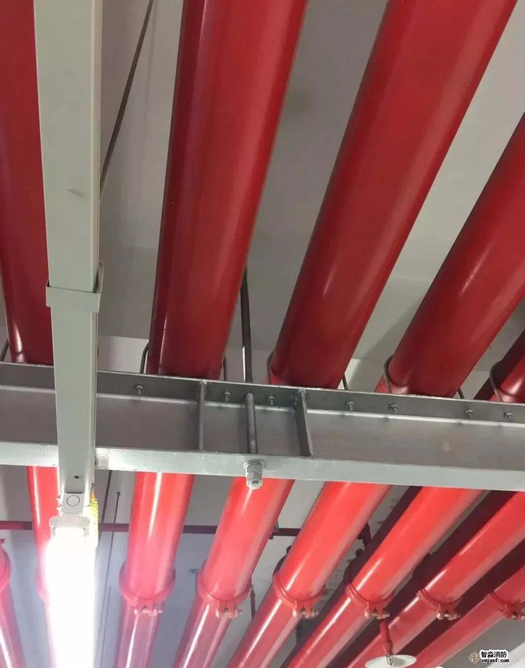 成排管道,成排成線,支吊架牢固,管道刷漆觀感美觀。