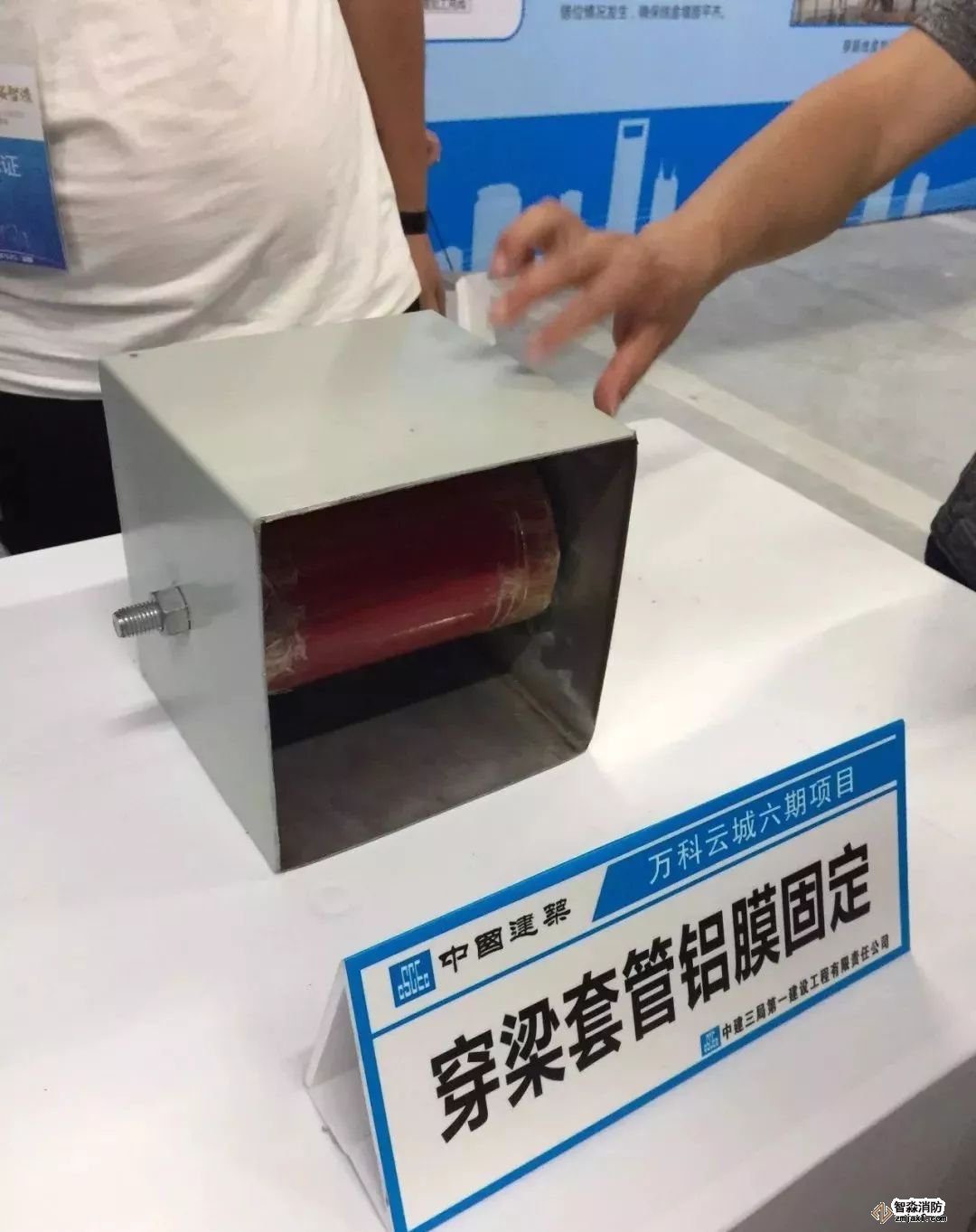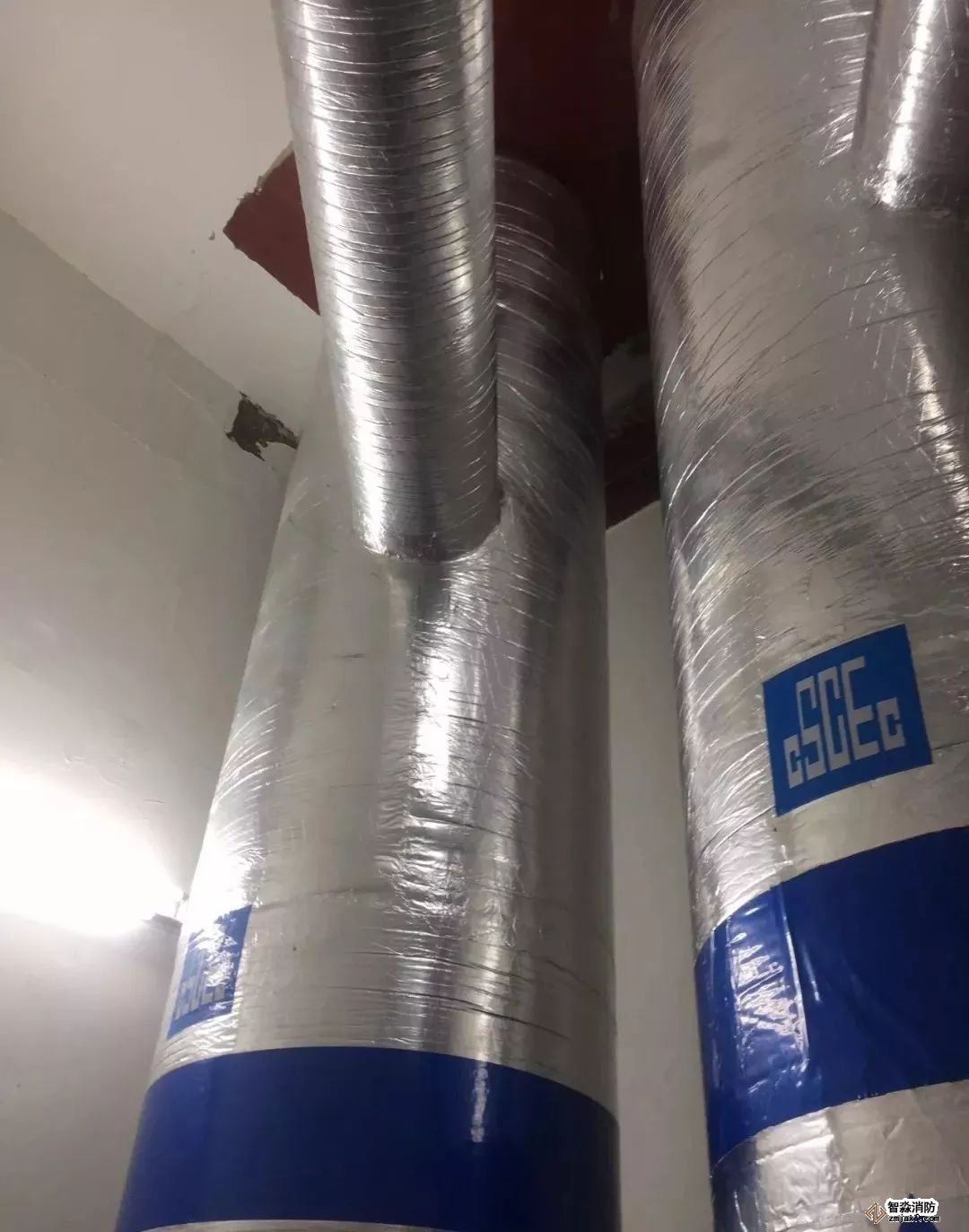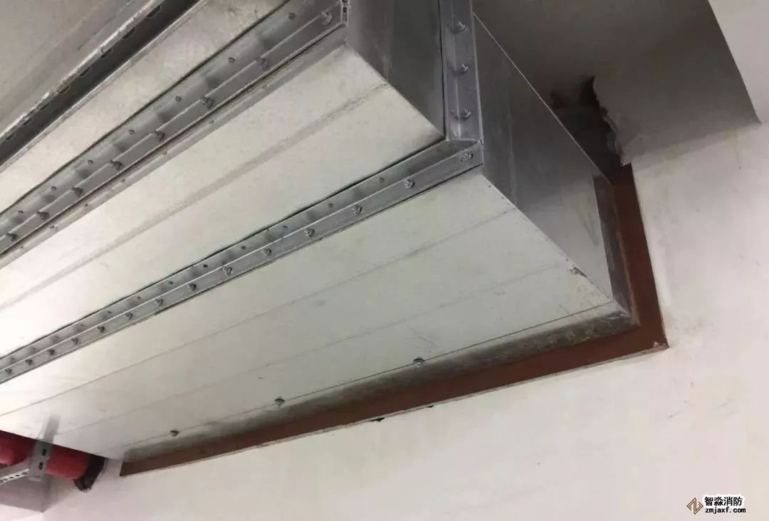 風(fēng)管穿墻,防火泥封堵到位,界面清楚。