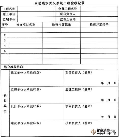 2、自動噴水滅火系統(tǒng)工程驗收應按自動噴水滅火系統(tǒng)工程驗收記錄表填寫。