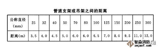 4)配水支管上每一直管段、相鄰兩噴頭之間的管段設置的吊架均不宜少于1個,吊架的間距不宜大于3.6m。