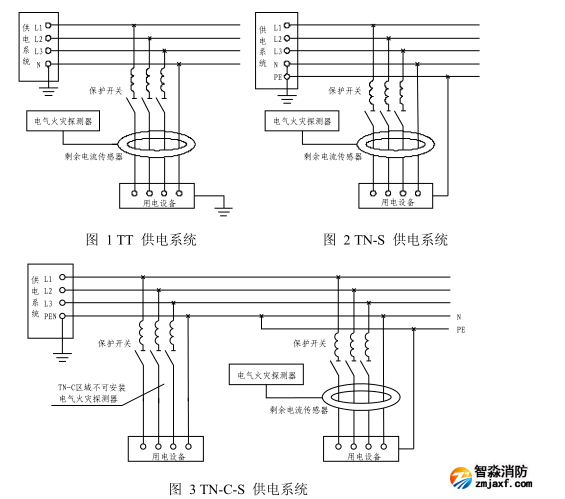 2) 在接地方式為 TN-C-S 供電系統(tǒng)中,電氣火災監(jiān)控系統(tǒng)的監(jiān)控節(jié)點必須設置在 N 線與 PE 線分開以后的部分。