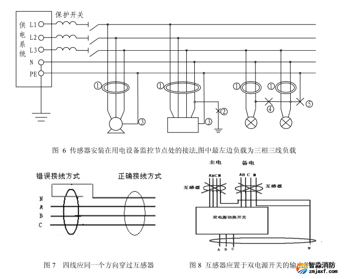 2) 每個監(jiān)控點處凡不通過負荷電流的電纜 PE 或 PEN不得穿過傳感器,應如下圖中標③處所示。