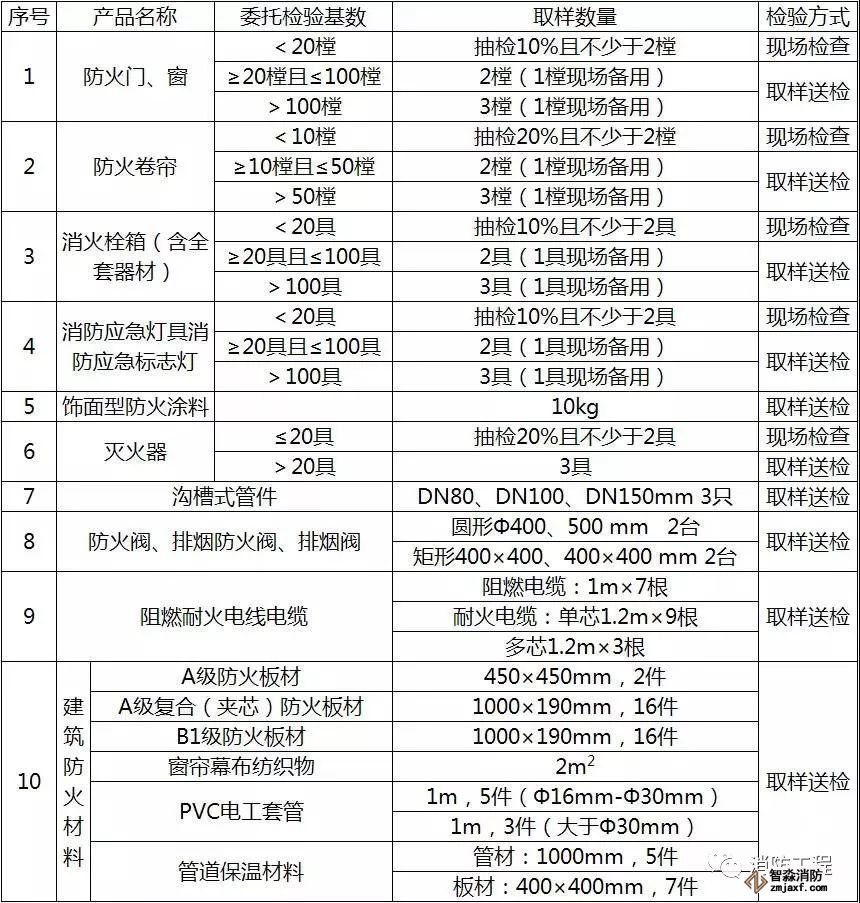 工程建設領域選用消防產品委托檢驗基數及取樣數量列表