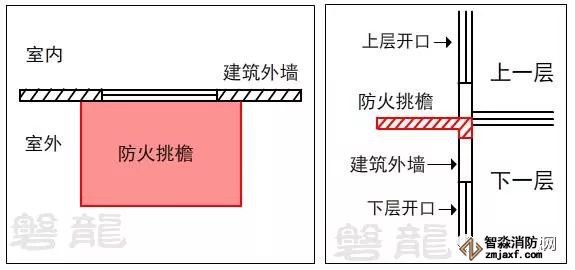 防火挑檐是挑出建筑外立面,具有一定寬度和長度的防火分隔措施,防火挑檐可以防止火災(zāi)通過建筑外立面的開口(從建筑外部)在上下層間蔓延。