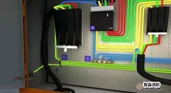 6、黃、綠、紅三相線分別從分配電箱的分路隔離開關引出,從N板接線端子引出淡藍色的工作零線,從PE板接線端子引出黃綠雙色保護零線。