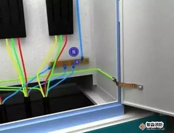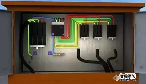 2、線路的黃、綠、紅三相線接入到二級分配電箱的總隔離開關上,淡藍色的N線接入到漏電保護器的N端上,通過漏保后接到工作零線端子板。