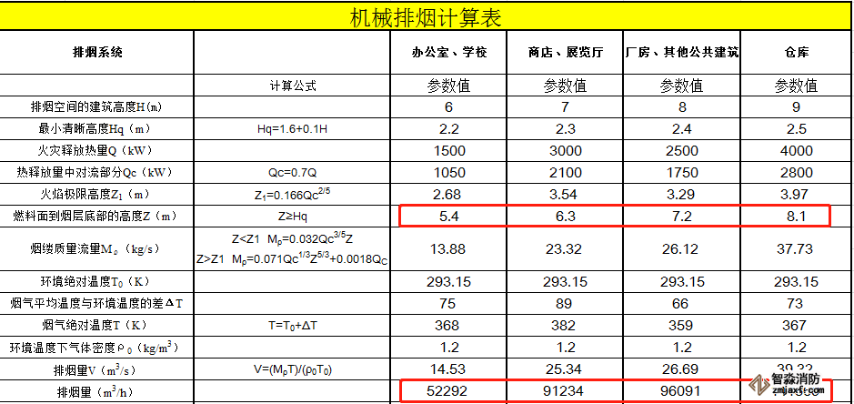 通過(guò)反算可知,表4.6.3中的排煙量數(shù)據(jù),應(yīng)該是按儲(chǔ)煙倉(cāng)高度為10%房間凈高時(shí)的結(jié)果(以下為有噴淋情況的反算推算表),儲(chǔ)煙倉(cāng)高度為房間凈高的10%,是規(guī)范要求的機(jī)械排煙最小儲(chǔ)煙倉(cāng)厚度,也是燃料面到煙層底部高度(Z)的最大高度,由下表公式可知,相同條件下,煙層底部高度(Z)最大值時(shí)對(duì)應(yīng)的排煙量即最大排煙量,也就是說(shuō),表4.6.3所列的排煙量為最大排煙量,任何其他計(jì)算條件下的排煙量都不可能大于這個(gè)排煙量,再規(guī)定計(jì)算值不應(yīng)小于表4.6.3中的數(shù)值無(wú)意義。