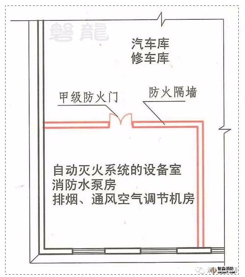 需要說明的是,同時為汽車庫和其他功能部分服務的設(shè)備用房,不應劃入汽車庫防火分區(qū),應采用防火墻和耐火極限不低于2.00h的不燃性樓板與汽車庫分隔,且人員不得通過汽車庫疏散,詳見專題:設(shè)備用房與汽車庫-疏散關(guān)系及應用誤區(qū)!