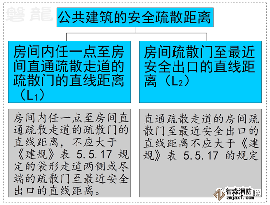因此,規(guī)范圖示沒(méi)有明示疏散走道盡端到安全出口的距離要求,通常情況下,僅需控制好疏散門到安全出口的距離即可。