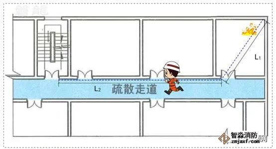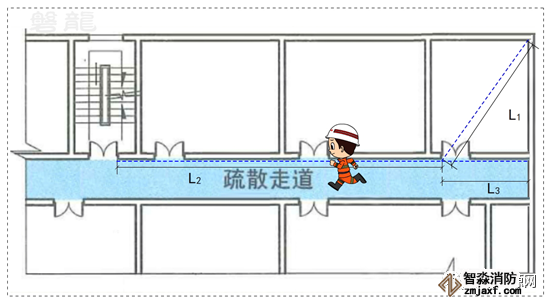 疏散走道是用于人員疏散通行至安全出口或相鄰防火分區(qū)的走道,疏散走道的兩側(cè)隔墻和樓板應(yīng)滿足相應(yīng)建筑耐火等級(jí)的燃燒性能和耐火極限要求,疏散走道不能有可燃物,也不能作為工作或作業(yè)場(chǎng)所。因此,通常情況下,疏散走道不會(huì)是火災(zāi)發(fā)生部位,人員也不會(huì)在走道過(guò)多逗留。另一方面,疏散走道兩側(cè)房間內(nèi)的疏散距離,也從側(cè)面限制了疏散走道的長(zhǎng)度。