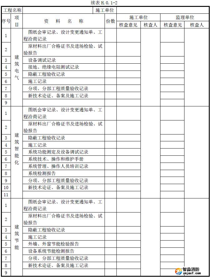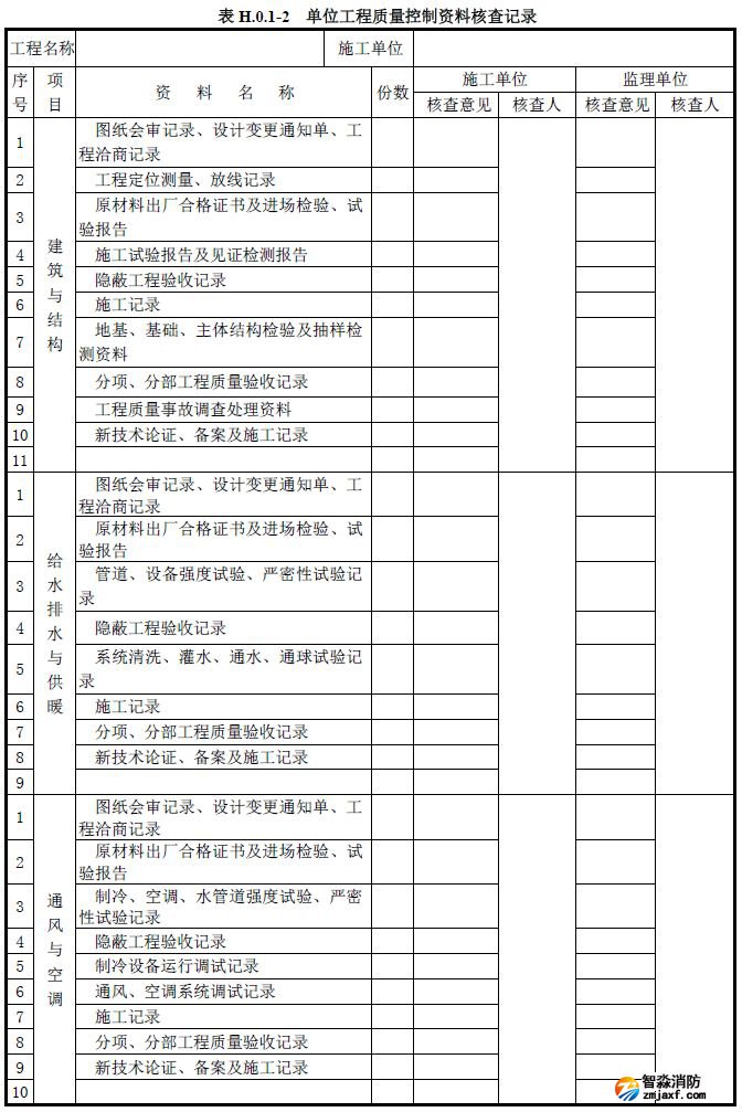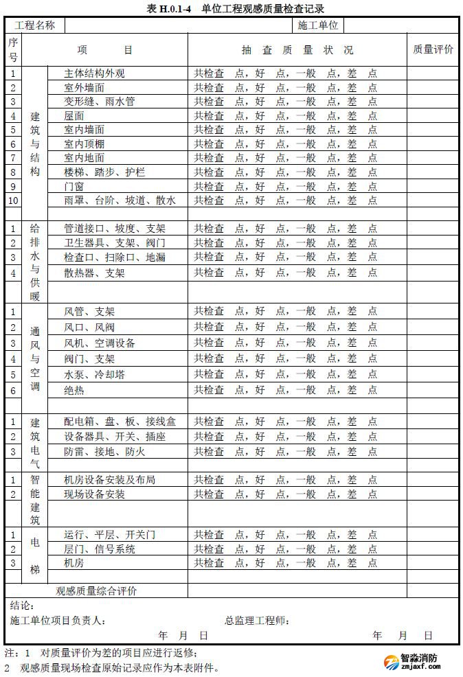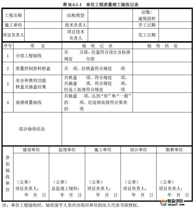 單位工程質(zhì)量竣工驗收記錄、質(zhì)量控制資料核查記錄、安全和功能檢驗資料核查及主要功能抽查記錄、觀感質(zhì)量檢查記錄應按《建筑工程施工質(zhì)量驗收統(tǒng)一標準》附錄H填寫。