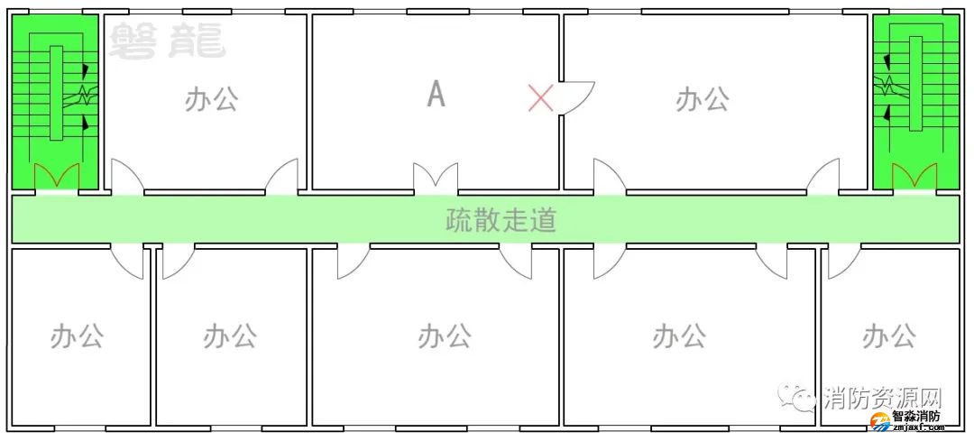 圖示5的辦公室A需要兩個(gè)疏散門(mén),疏散門(mén)應(yīng)直接通向疏散走道,不應(yīng)通過(guò)其他房間疏散。