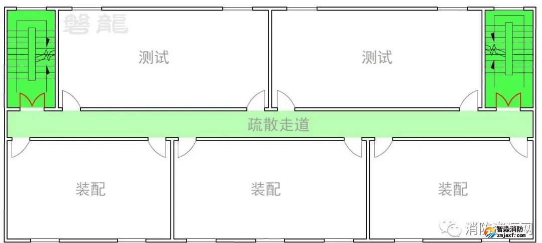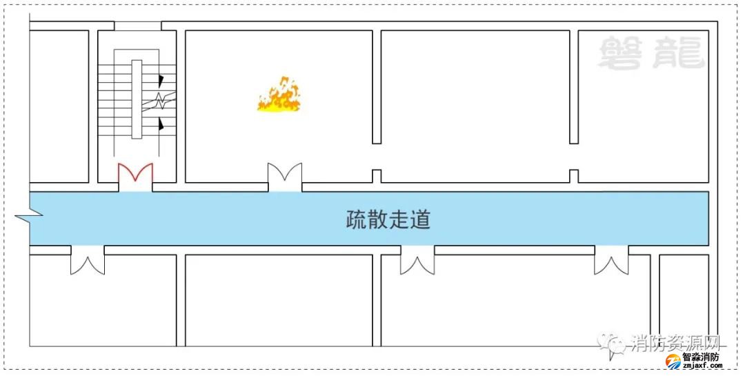 三、人員疏散過(guò)程中,從危險(xiǎn)區(qū)域(房間等)應(yīng)進(jìn)入次危險(xiǎn)區(qū)域(疏散走道等)或相對(duì)安全區(qū)域、安全區(qū)域,不應(yīng)通過(guò)其他危險(xiǎn)區(qū)域疏散,示例:
