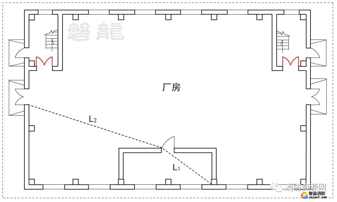 2、廠房倉(cāng)庫(kù)同樣不應(yīng)采用嵌套(穿套)設(shè)置的方式,確因功能需要,嵌套(穿套)設(shè)置的房間不應(yīng)超過(guò)一級(jí),疏散距離應(yīng)按人員行走的直線距離計(jì)算,在圖示7的廠房中,示例房間內(nèi)任一點(diǎn)至安全出口的直線距離,應(yīng)為L(zhǎng)1+L2。