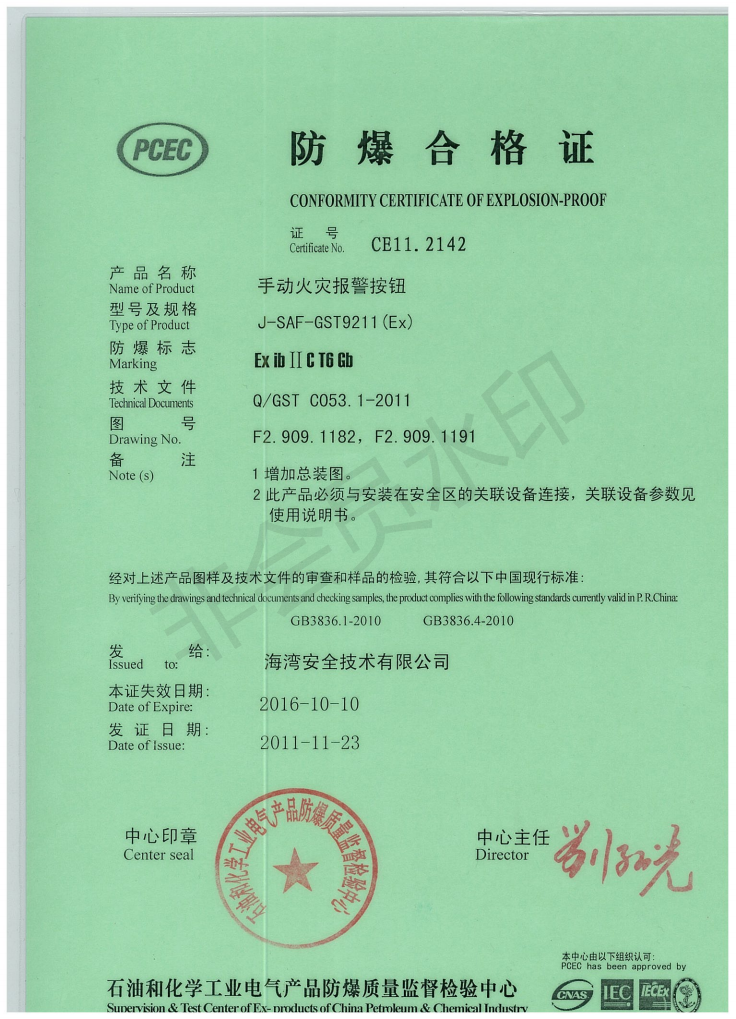 合格證中,GST9211-Ex的防爆標(biāo)志為:Ex d ib II C T6 Gb,按照圖中紅色序號順序,所代表的含義分別為:①防爆標(biāo)志;②防爆形式;③設(shè)備類別;④氣體級別;⑤設(shè)備最高表面溫度級別;⑥設(shè)備保護級別。