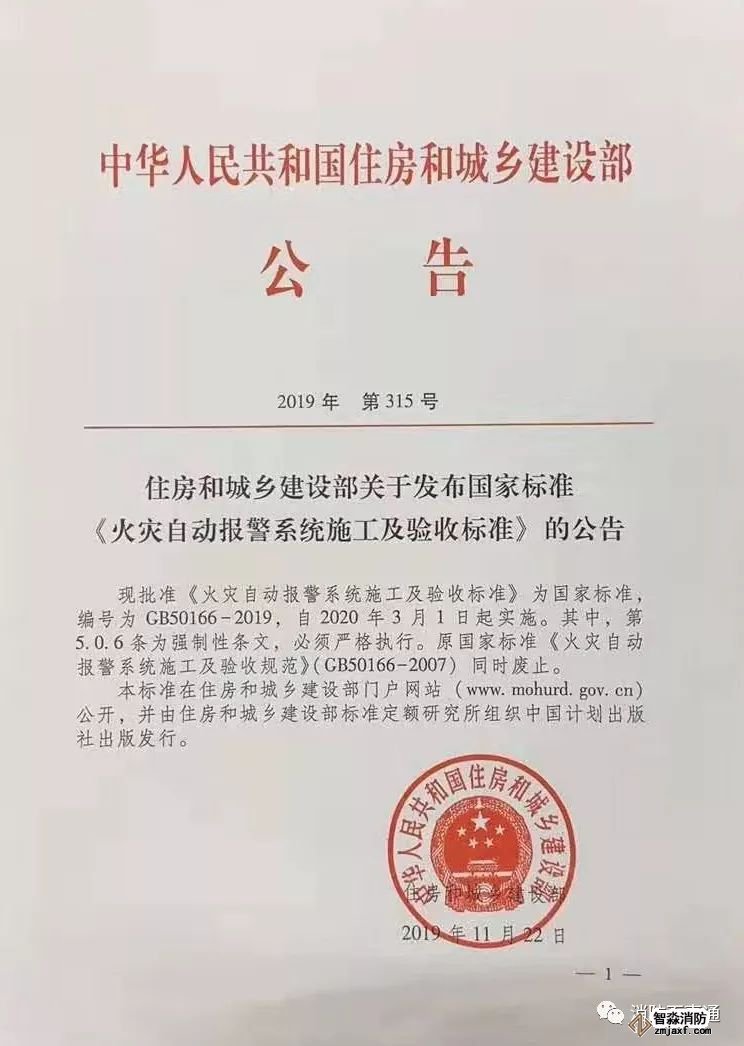 現(xiàn)批準《火災自動報警系統(tǒng)施工及驗收標準》為國家標準,編號為GB50166-2019,自2020年3月1日起實施。其中,第5.0.6條為強制性條文,必須嚴格執(zhí)行。原國家標準《火災自動報警系統(tǒng)施工及驗收規(guī)范》(GB50166-2007)同時廢止。