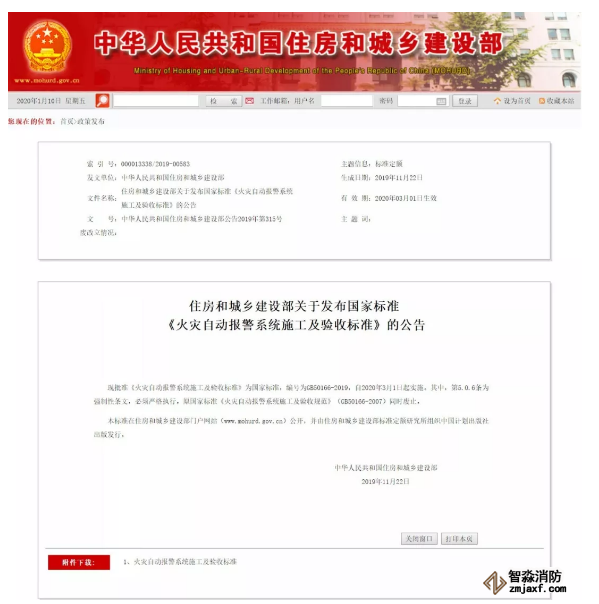 住建部公布了GB50166-2019《火災(zāi)自動報警系統(tǒng)施工及驗(yàn)收標(biāo)準(zhǔn)》,自2020年3月1日起實(shí)施。其中,第5.0.6條為強(qiáng)制性條文。原國家標(biāo)準(zhǔn)《火災(zāi)自動報警系統(tǒng)施工及驗(yàn)收規(guī)范》(GB50166-2007)同時廢止。