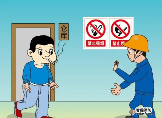 8. 生產(chǎn)車間、原料及成品庫房禁止攜帶火種進(jìn)入,禁止動用明火、禁止吸煙,設(shè)置醒目的嚴(yán)禁煙火警示牌。