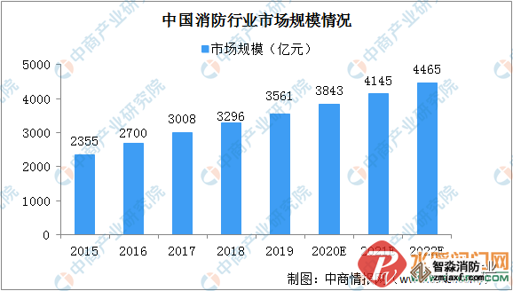 消防安全意識(shí)逐步提高,消防逐漸成為主動(dòng)需求。城鎮(zhèn)化水平和交通運(yùn)輸?shù)扰涮淄顿Y不斷提高,持續(xù)帶動(dòng)消防需求隨著我國(guó)城鎮(zhèn)化水平的不斷提升,消防行業(yè)的發(fā)展也迎來(lái)重要契機(jī)。近幾年,消防行業(yè)規(guī)模迅速擴(kuò)大。2015年消防行業(yè)市場(chǎng)規(guī)模2355億元,2019年市場(chǎng)規(guī)模突破3500億元,預(yù)計(jì)2022年市場(chǎng)規(guī)模將達(dá)到4465億元。