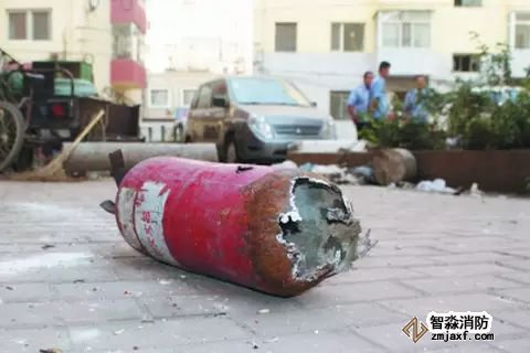 2013年2月,新疆一個(gè)電器商場(chǎng)發(fā)生滅火器爆炸事故,墻角的瓶裝滅火器已經(jīng)變成一張鐵皮。