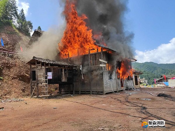 木結(jié)構(gòu)房屋實(shí)體火災(zāi)實(shí)驗(yàn)進(jìn)行中
