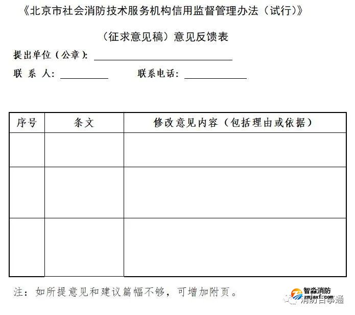 關(guān)于征求《北京市社會消防技術(shù)服務(wù)機構(gòu)信用監(jiān)督管理辦法(試行)》(征求意見稿)意見的通知各消防技術(shù)服務(wù)機構(gòu),各社會單位:為進一步優(yōu)化營商環(huán)境,規(guī)范社會消防技術(shù)服務(wù)機構(gòu)市場秩序,增強社會消防技術(shù)服務(wù)市場誠信意識,提高事中事后監(jiān)管效能,北京市消防救援總隊制定了《北京市社會消防技術(shù)服務(wù)機構(gòu)信用監(jiān)督管理辦法(試行)》(見附件1),現(xiàn)向社會公開征求意見。請結(jié)合實際工作認真研究,將意見填入“意見反饋表”(見附件2)中,于2022年4月8日前,將加蓋公章的意見反饋表及word版原件發(fā)送至lyq401@163.com。1.《北京市社會消防技術(shù)服務(wù)機構(gòu)信用監(jiān)督管理辦法(試行)》征求意見稿(聯(lián)系人:李永慶;電話:82215169)北京市社會消防技術(shù)服務(wù)機構(gòu)信用監(jiān)督管理辦法(試行)第一條 為進一步優(yōu)化營商環(huán)境,規(guī)范社會消防技術(shù)服務(wù)機構(gòu)市場秩序,增強社會消防技術(shù)服務(wù)市場誠信意識,提高事中事后監(jiān)管效能,根據(jù)《關(guān)于深化消防執(zhí)法改革的實施意見》、《社會消防技術(shù)服務(wù)管理規(guī)定》、《北京市優(yōu)化營商環(huán)境條例》等規(guī)定要求,制定本辦法。第二條 北京市消防救援機構(gòu)對本市行政區(qū)域內(nèi)開展消防技術(shù)服務(wù)活動的社會消防技術(shù)服務(wù)機構(gòu)實施信用評價、信用監(jiān)管、信用公示、修復(fù)和信用懲戒等,適用本辦法。第三條 社會消防技術(shù)服務(wù)機構(gòu)應(yīng)當(dāng)依照法律法規(guī)、國家、行業(yè)、地方標(biāo)準和執(zhí)業(yè)準則開展技術(shù)服務(wù)活動,并對服務(wù)質(zhì)量負責(zé)。第四條 倡導(dǎo)和鼓勵社會消防技術(shù)服務(wù)機構(gòu)積極參加公益性消防技術(shù)服務(wù)以及消防救援機構(gòu)組織的重要場所消防服務(wù)保障、消防行政管理輔助活動等。第五條 社會消防技術(shù)服務(wù)機構(gòu)應(yīng)當(dāng)加強誠信建設(shè)和守信教育,健全內(nèi)部誠信制度,提高誠信經(jīng)營水平。第六條 消防技術(shù)服務(wù)機構(gòu)信用等級劃分為優(yōu)(A、A-)、良(B+、B、B-)、中(C+、C、C-)、差(D)四等九級。第七條 消防技術(shù)服務(wù)機構(gòu)信用等級評價采用積分制,分值由基礎(chǔ)分、加分、減分構(gòu)成,基礎(chǔ)分為700分。第八條 消防技術(shù)服務(wù)機構(gòu)信用等級根據(jù)評價周期內(nèi)積分確定:第九條 消防技術(shù)服務(wù)機構(gòu)信用等級評價周期為一個自然年度,每個評價周期初始分值為700分,評價周期屆滿,積分清除,不轉(zhuǎn)入下一個評價周期。首次評價周期為評價標(biāo)準發(fā)布之日至當(dāng)年12月31日。第十條 在評價周期內(nèi),評價對象在重大火災(zāi)事故、特別重大火災(zāi)事故中負有主要責(zé)任或被列入消防安全嚴重失信主體名單的,直接評定為D級并即時調(diào)整公布評價信息。第十一條 消防技術(shù)服務(wù)機構(gòu)信用等級評價結(jié)果在市消防救援總隊相關(guān)網(wǎng)站進行公示,公示期滿后,向社會正式公布。第十二條 消防技術(shù)服務(wù)機構(gòu)對信用評價結(jié)果有異議的,可在結(jié)果公示之日起7個工作日內(nèi),向市消防救援總隊提交異議申請。市消防救援總隊自收到異議申請之日起7個工作日內(nèi)給予書面答復(fù)。申請被采納的,對評價結(jié)果進行調(diào)整。第十三條 消防技術(shù)服務(wù)機構(gòu)具有下列行為之一的,每項次減100分:(一)不具備從業(yè)條件從事消防技術(shù)服務(wù)活動的;(三)冒用其他消防技術(shù)服務(wù)機構(gòu)名義從事社會消防技術(shù)服務(wù)活動的;(四)無健全的質(zhì)量管理體系或消防安全評估過程控制體系的;(五)經(jīng)火災(zāi)事故調(diào)查認定,對亡人或重大社會影響的火災(zāi)事故負有主要責(zé)任的;(七)向消防救援機構(gòu)提供虛假證明材料的。第十四條 消防技術(shù)服務(wù)機構(gòu)具有下列行為之一的,每項次減50分:(一)出具的書面結(jié)論文件未簽名、蓋章的;(二)所屬注冊消防工程師同時在兩個以上消防技術(shù)服務(wù)機構(gòu)執(zhí)業(yè)或在其他機關(guān)、團體、企業(yè)、事業(yè)單位任職的;(三)指派無相應(yīng)資格從業(yè)人員從事社會消防技術(shù)服務(wù)活動的;(四)消防設(shè)施維護保養(yǎng)檢測機構(gòu)的項目負責(zé)人或者消防設(shè)施操作員未到現(xiàn)場實地開展工作的;(五)轉(zhuǎn)包、分包消防技術(shù)服務(wù)項目的;(六)未按照國家、行業(yè)、地方標(biāo)準開展檢測、維護保養(yǎng)、評估的。第十五條 消防技術(shù)服務(wù)機構(gòu)具有下列行為之一的,每項次減25分:(一)未設(shè)立技術(shù)負責(zé)人、明確項目負責(zé)人的;(二)未依法與委托人簽訂消防技術(shù)服務(wù)合同的;(三)未建立和保管消防技術(shù)服務(wù)檔案的;(四)未在經(jīng)營場所公示營業(yè)執(zhí)照、工作程序、收費標(biāo)準、從業(yè)守則、注冊消防工程師注冊證書、投訴電話等事項的;(五)未在經(jīng)其維護保養(yǎng)的消防設(shè)施所在建筑的醒目位置上公示消防技術(shù)服務(wù)信息的。第十六條 消防技術(shù)服
