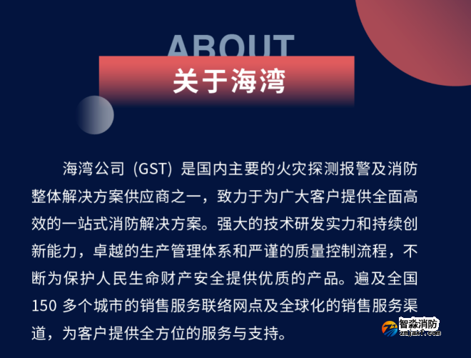 海灣公司(GST)是國內(nèi)主要的火災(zāi)探測報警及消防整體解決方案供應(yīng)商之一,致力于為廣大客戶提供全面高效的一站式消防解決方案。強大的技術(shù)研發(fā)實力和持續(xù)創(chuàng)新能力,卓越的生產(chǎn)管理體系和嚴謹?shù)馁|(zhì)量控制流程,不斷為保護人民生命財產(chǎn)安全提供優(yōu)質(zhì)的產(chǎn)品。遍及全國150 多個城市的銷售服務(wù)聯(lián)絡(luò)網(wǎng)點及全球化的銷售服務(wù)渠道,為客戶提供全方位的服務(wù)與支持。