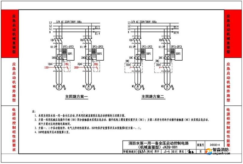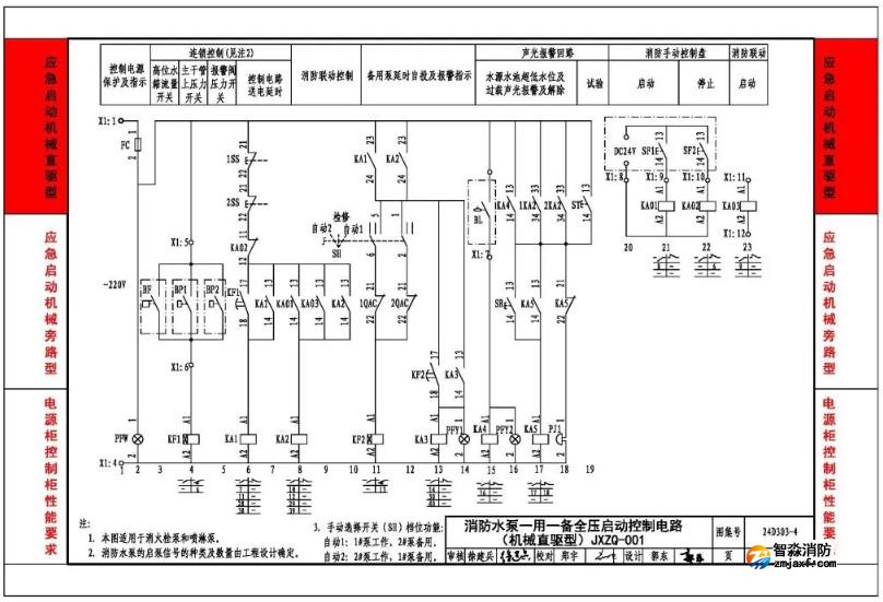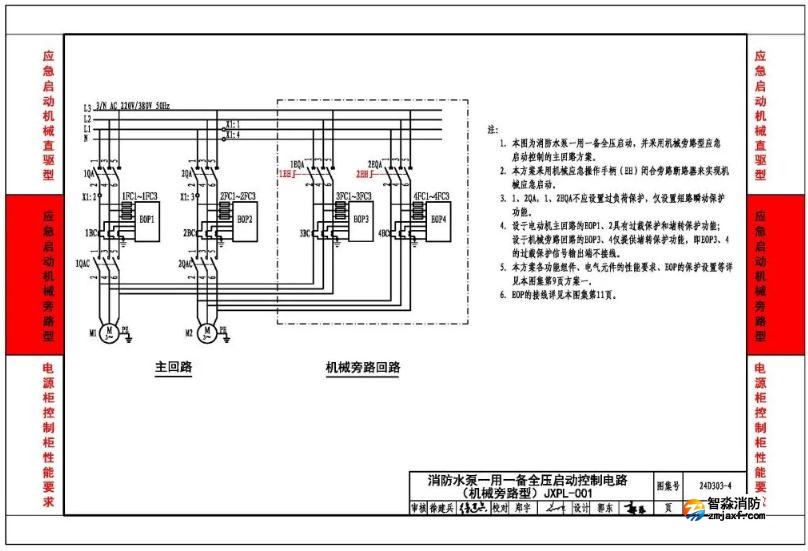 國(guó)家建筑標(biāo)準(zhǔn)設(shè)計(jì)24D303-4《消防水泵機(jī)械應(yīng)急啟泵控制》是基于國(guó)家標(biāo)準(zhǔn)《消防給水及消火栓系統(tǒng)技術(shù)規(guī)范》GB 50974-2014第11.0.12條:消防水泵控制柜應(yīng)設(shè)置機(jī)械應(yīng)急啟泵功能,并應(yīng)保證在控制柜內(nèi)的控制線路發(fā)生故障時(shí)由有管理權(quán)限的人員在緊急時(shí)啟動(dòng)消防水泵。機(jī)械應(yīng)急啟泵時(shí),應(yīng)確保消防水泵在報(bào)警后5.0min內(nèi)正常工作。本條款對(duì)消防水泵機(jī)械應(yīng)急啟泵的控制有強(qiáng)制性要求。另外工程建設(shè)全文強(qiáng)制性工程建設(shè)規(guī)范《消防設(shè)施通用規(guī)范》GB 55036-2022第3.0.12條第3款:消防水泵控制柜應(yīng)具有機(jī)械應(yīng)急啟泵功能,且機(jī)械應(yīng)急啟泵時(shí),消防水泵應(yīng)能在接受火警后5min內(nèi)進(jìn)入正常運(yùn)行狀態(tài)。本條款對(duì)消防水泵機(jī)械應(yīng)急啟泵列入到技術(shù)法規(guī)中。