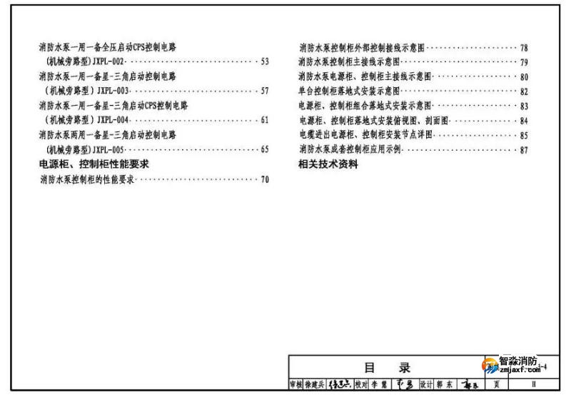 圖集提供消防水泵電動(dòng)機(jī)一用一備全壓?jiǎn)?dòng)、一用一備星-三角降壓?jiǎn)?dòng)、兩用一備星-三角降壓?jiǎn)?dòng)三種常用啟動(dòng)類型的機(jī)械應(yīng)急啟動(dòng)控制,水泵電動(dòng)機(jī)采用AC380V三相異步籠型電動(dòng)機(jī),最大容量為110kW。其他類型消防水泵機(jī)械應(yīng)急啟動(dòng)控制電路可根據(jù)國(guó)家建筑標(biāo)準(zhǔn)圖集D303-3《常用水泵控制電路圖》,并參考本圖集做相應(yīng)修改。