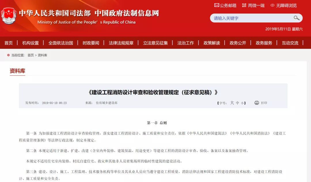 2019年5月10日,中國政府法制信息網(wǎng)發(fā)布:住房和城鄉(xiāng)建設(shè)部關(guān)于《建設(shè)工程消防設(shè)計審查和驗收管理規(guī)定(征求意見稿)》公開征求意見的通知。
