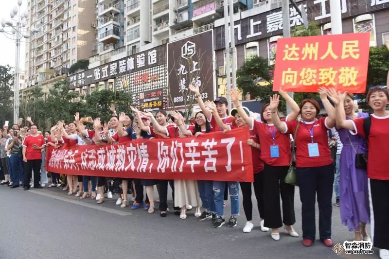 火災(zāi)成功撲救后,在撤離現(xiàn)場,達(dá)州市民自發(fā)到街道兩側(cè),拉起“消防官兵,你們辛苦了!”“感激有你們”等大大小小的橫幅,向消防官兵致敬和送行。