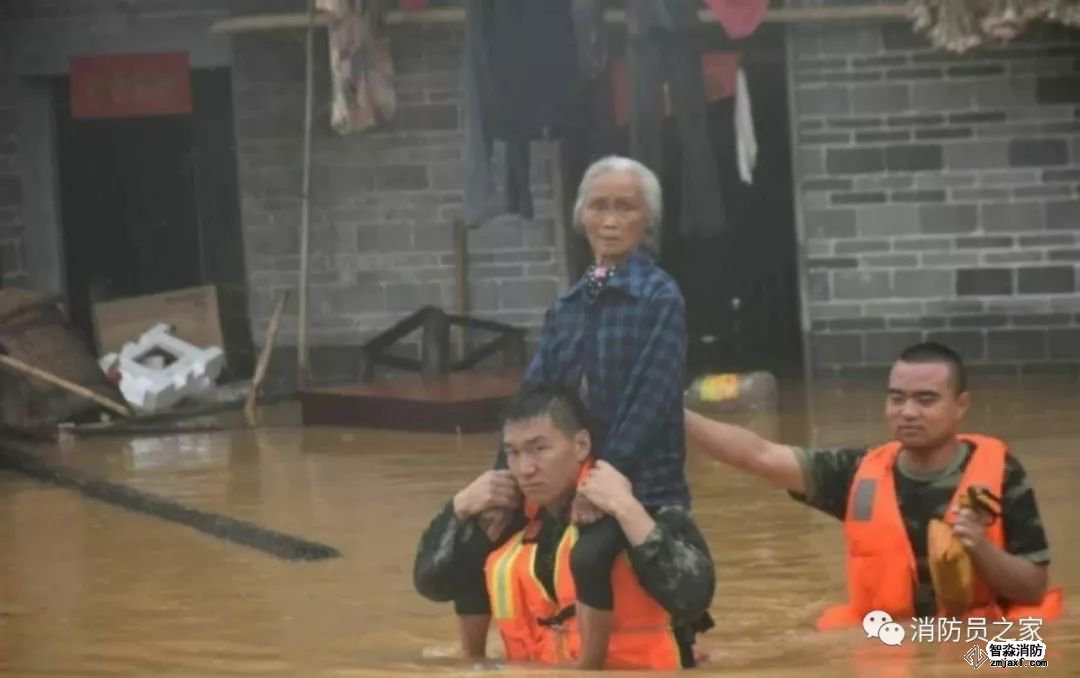 6月8日,受臺風(fēng)“艾云尼”外圍影響,江西省泰和縣境內(nèi)普降暴雨,造成水位暴漲,這位老人因左腿有疾行動不便,沖鋒舟無法靠近,為了不使她身上被水弄濕,消防戰(zhàn)士讓其騎在肩上,徒步趟過齊胸深的洪水。