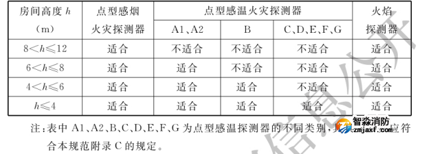 5.2.1 對(duì)不同高度的房間,可按表5.2.1選擇點(diǎn)型火災(zāi)探測(cè)器。